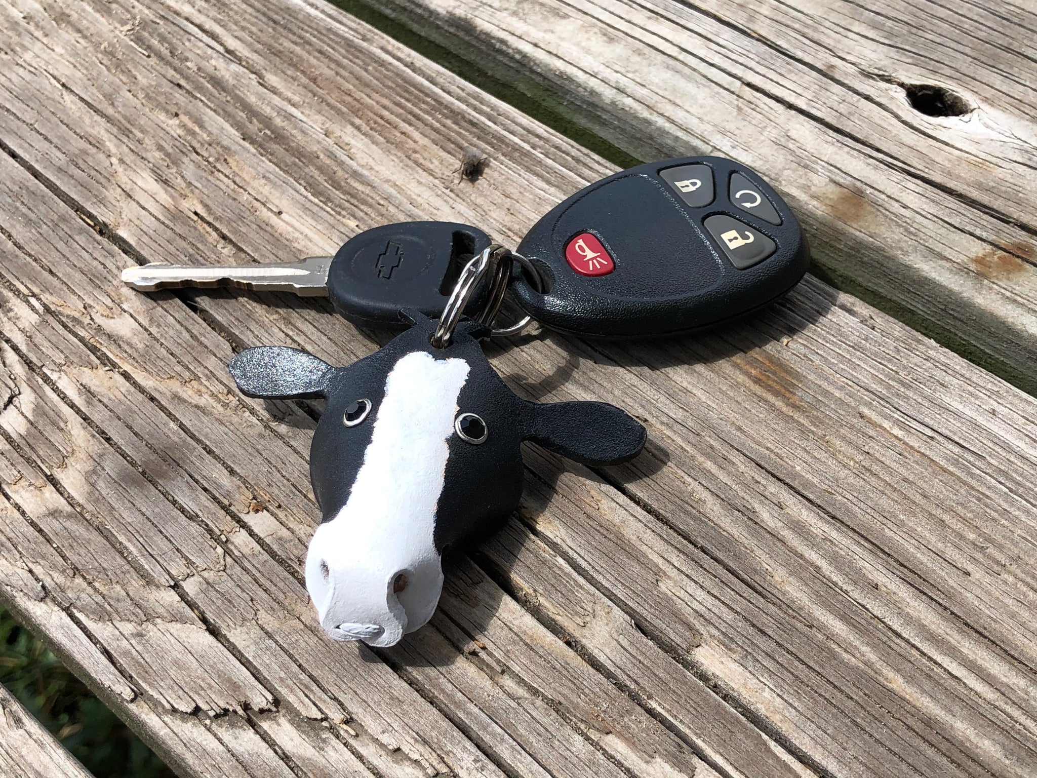 Our Holstein cow leather key chain measures approx 3 inches across and is about 2 1/2 inches tall with out the key ring.