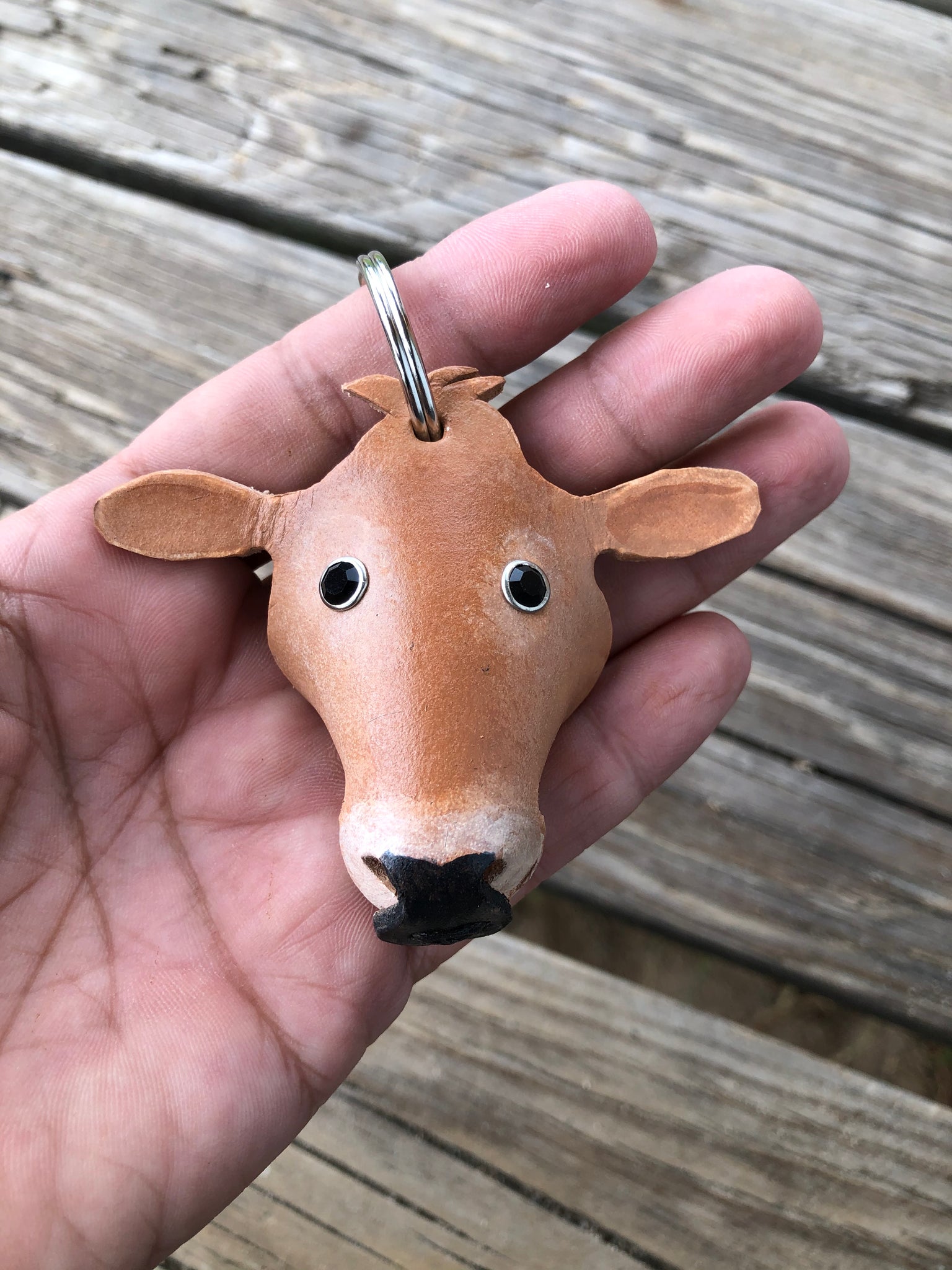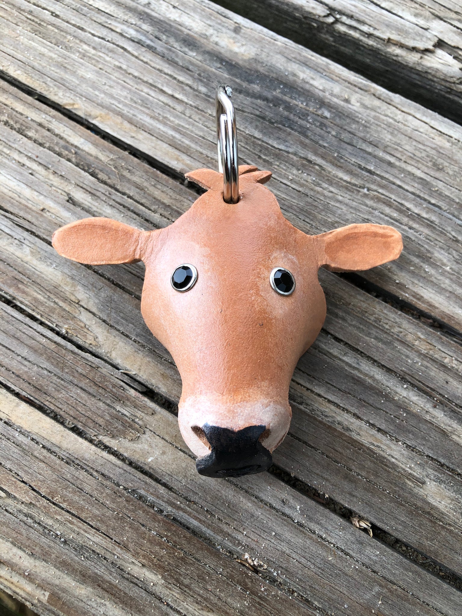 Our Jersey cow leather key chain measures approx 3 inches across and is about 2 1/2 inches tall with out the key ring.