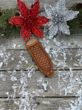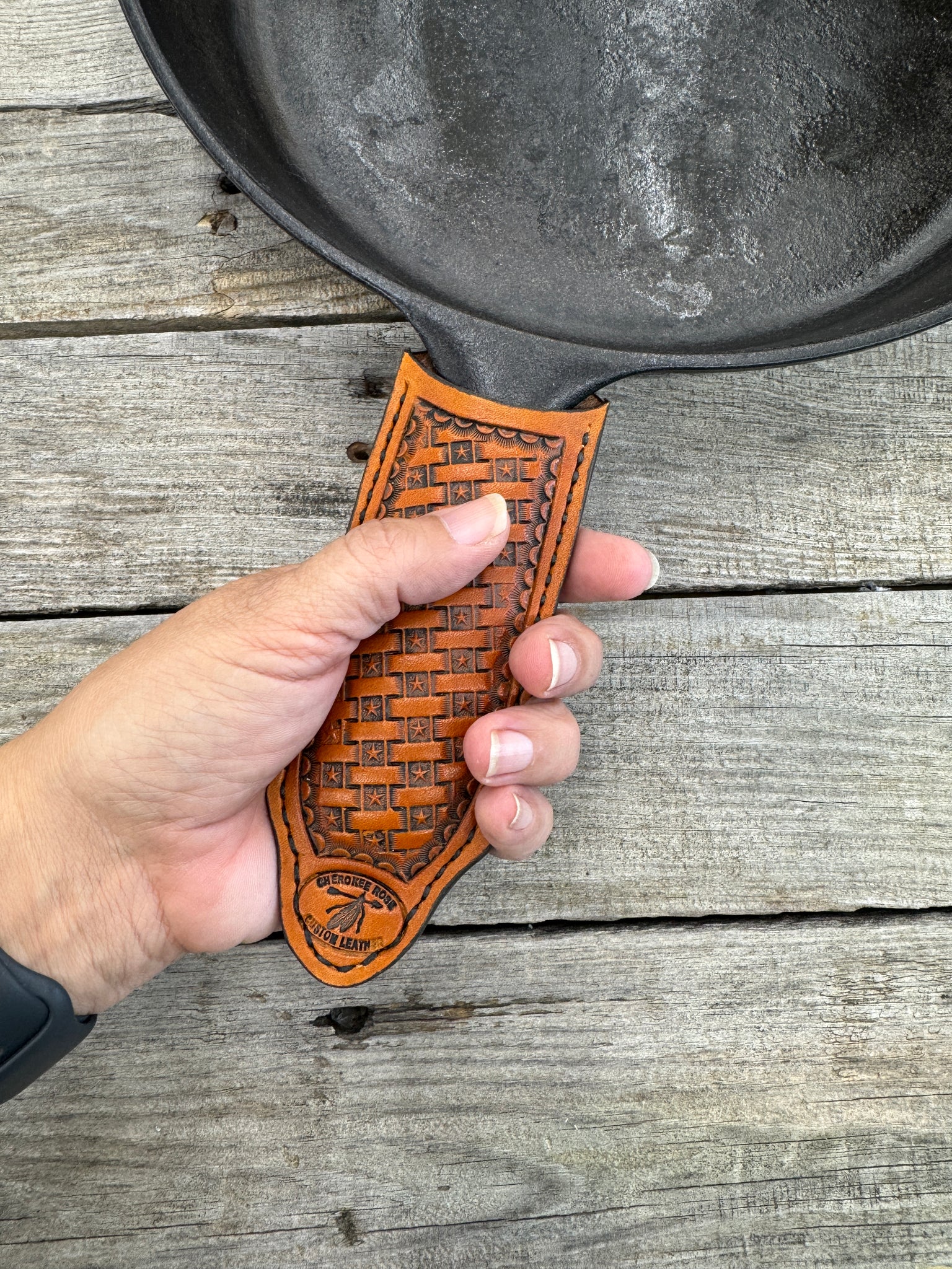 Crafted with the look and feel of a true Western heirloom, this Texas Star basketweave leather skillet handle cover brings tradition to your kitchen from Cherokee Rose Custom Leather.