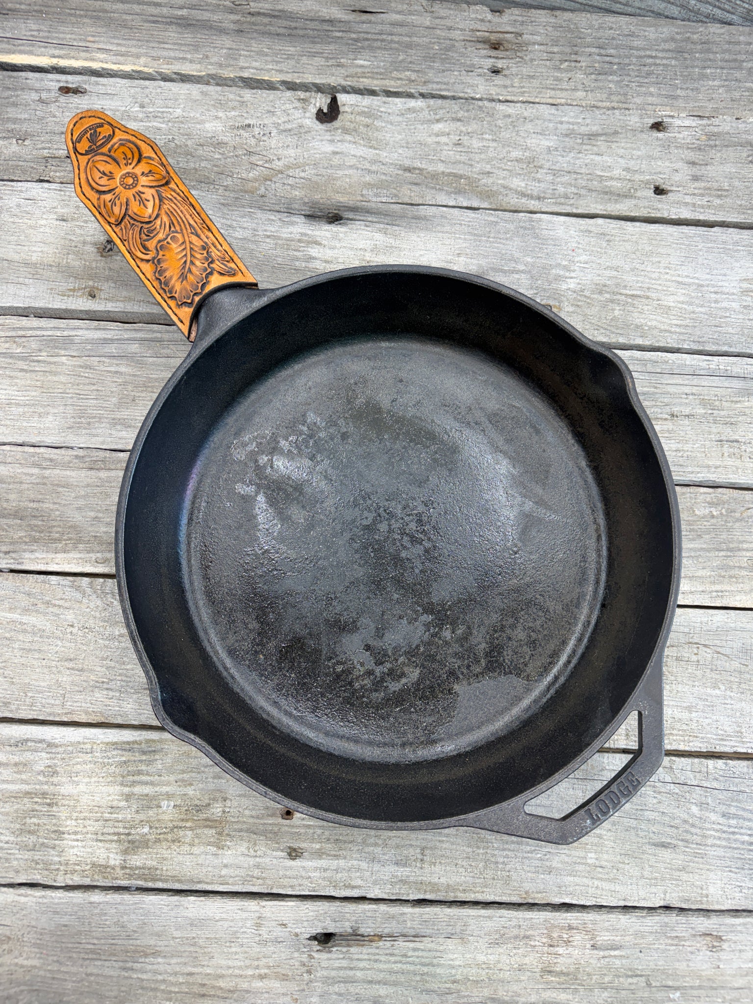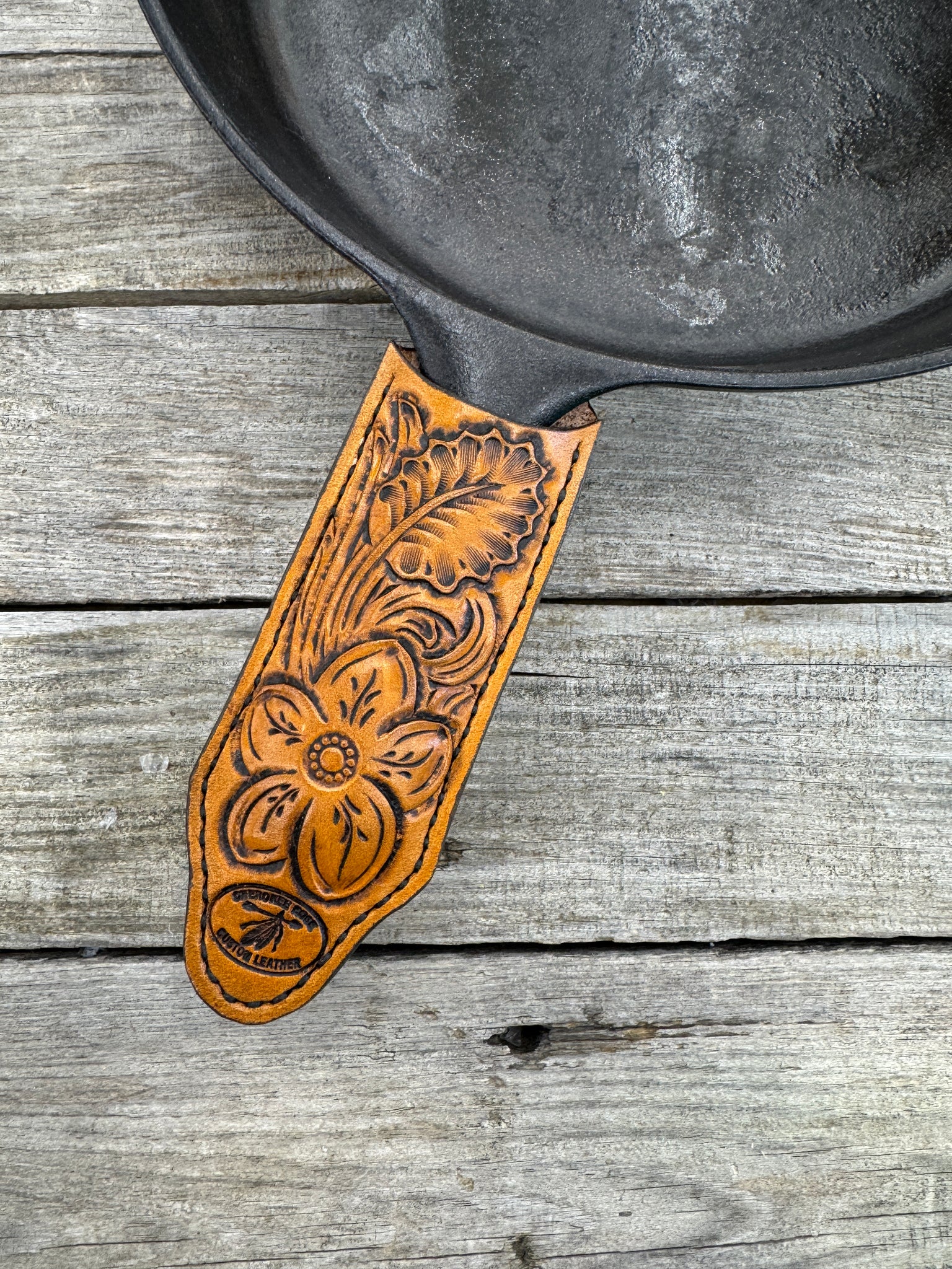 Blending classic Western artistry with a fresh, modern touch, this hand-tooled floral leather skillet handle cover from Cherokee Rose Custom Leather brings handcrafted beauty to everyday cooking.