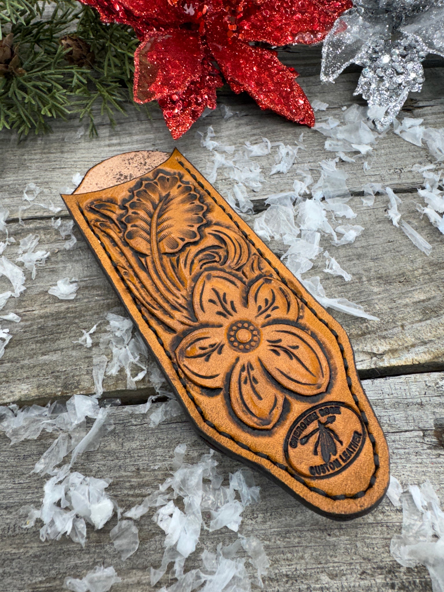 Each piece is made from 6/7 oz vegetable-tanned cowhide and features a bold, single flower accented by soft, flowing leaves — a contemporary spin on traditional Western carving. The leather is hand-dyed in a warm medium tan, highlighting every curve and detail of the tooling.