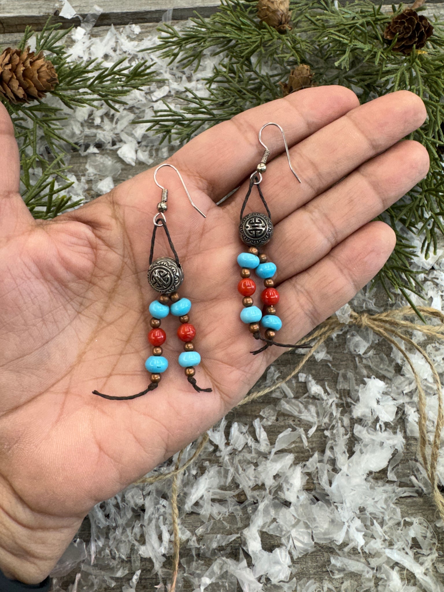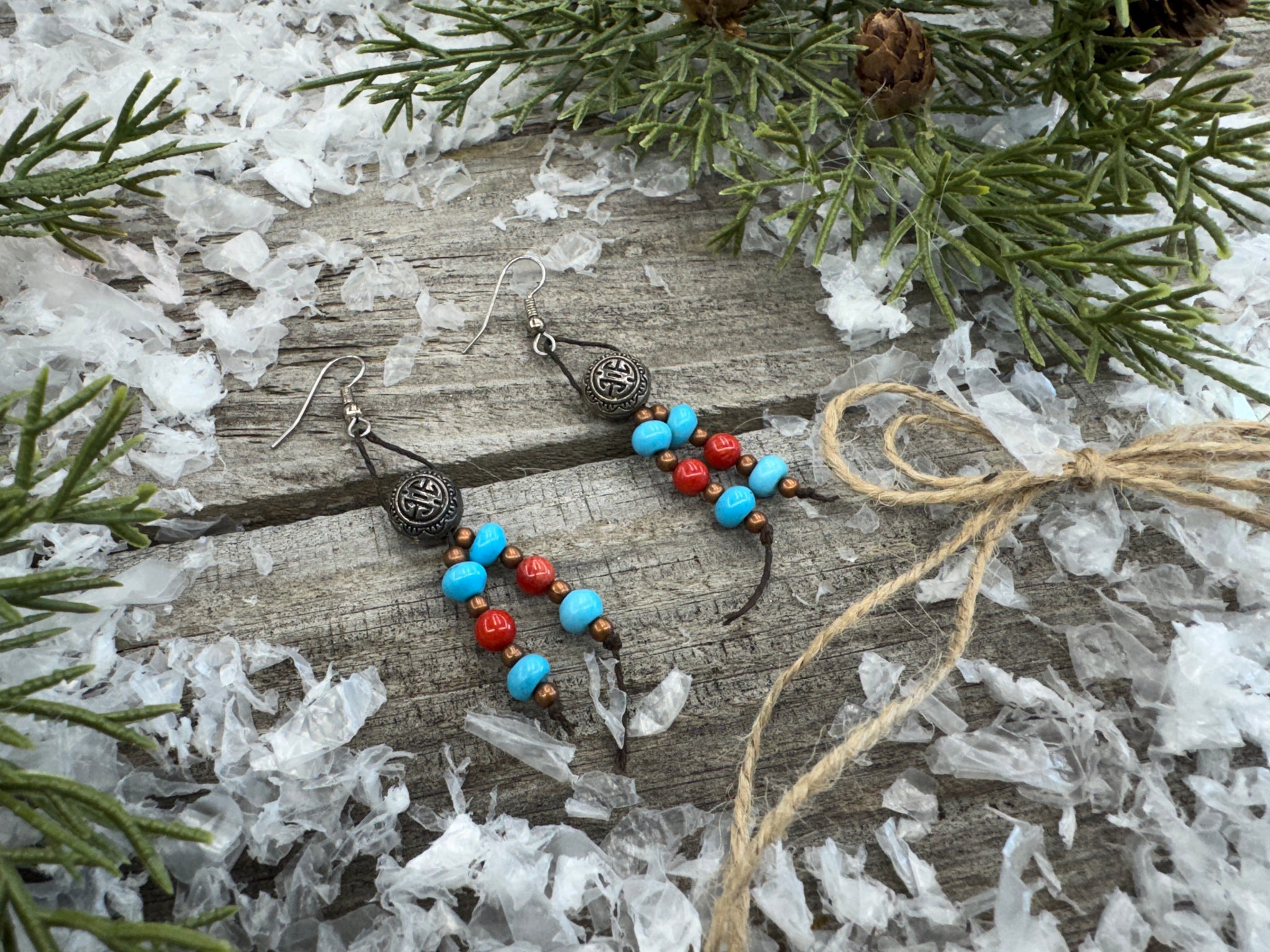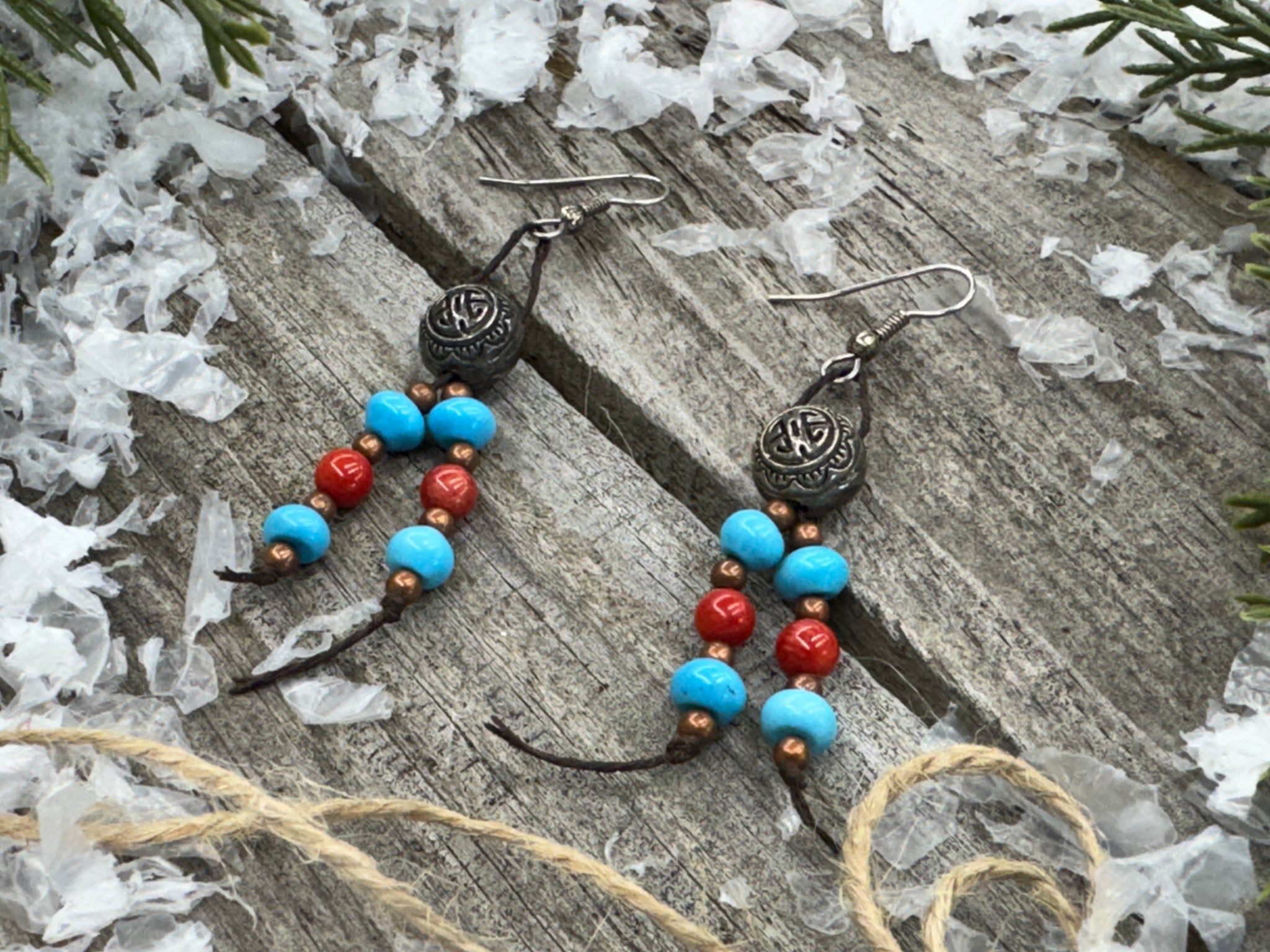 I made these easy to wear southwestern earrings using red coral and chalk turquoise beads accented with real brass beads. They are strung on waxed cord.