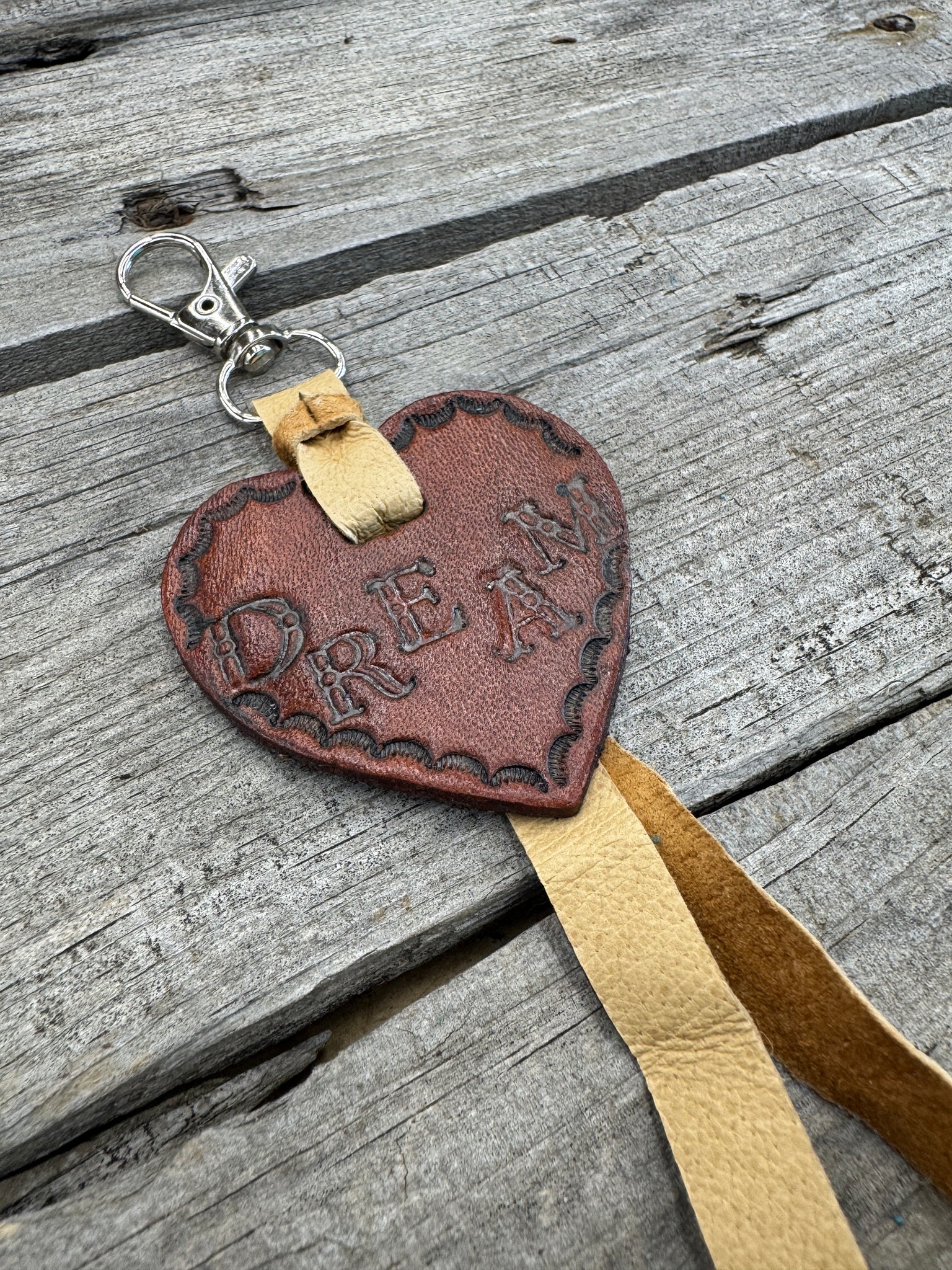 Dream – Hand-stamped lettering “Dream” with two-tone tan strap; overall length 12”