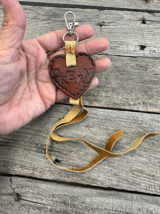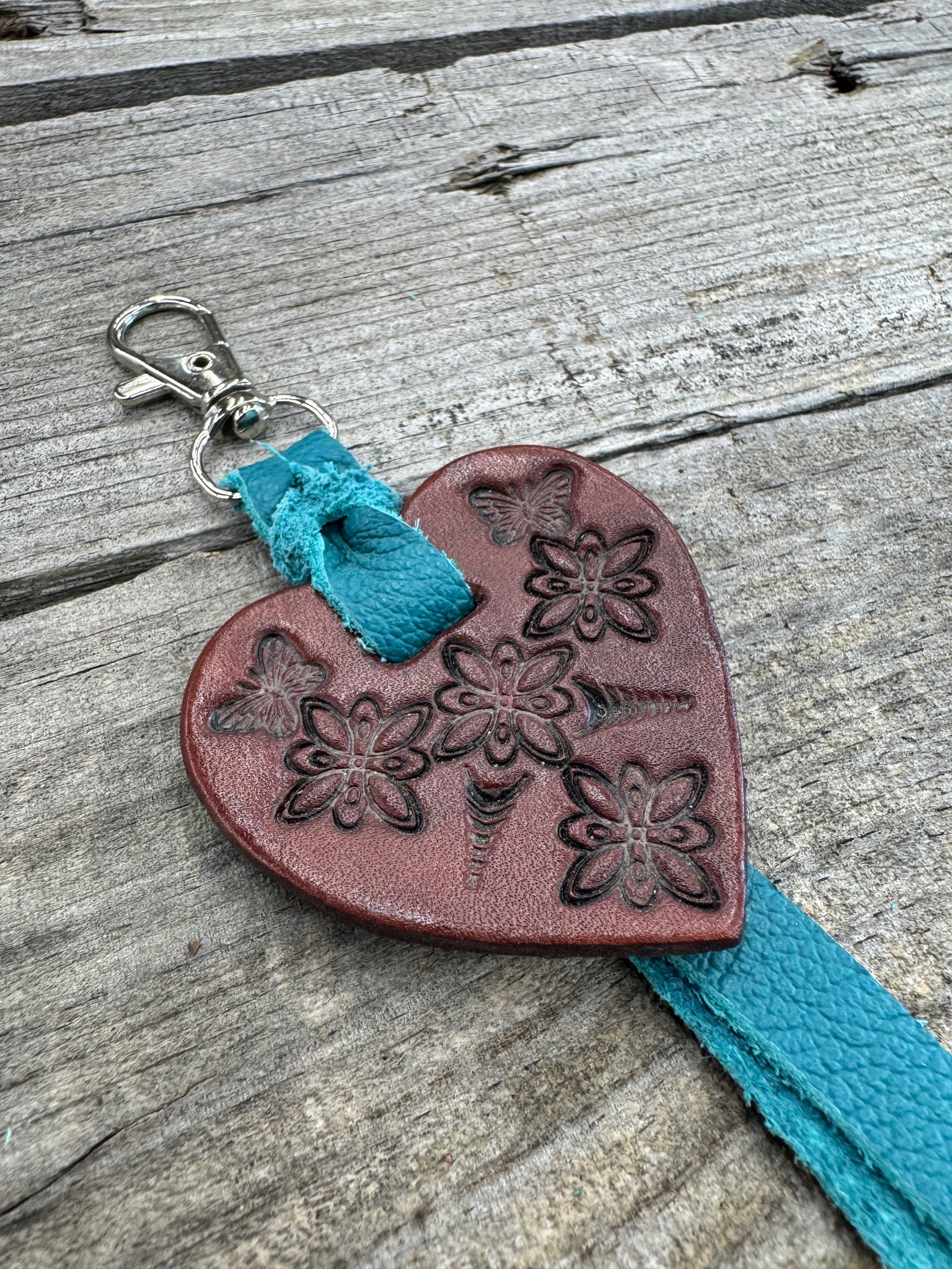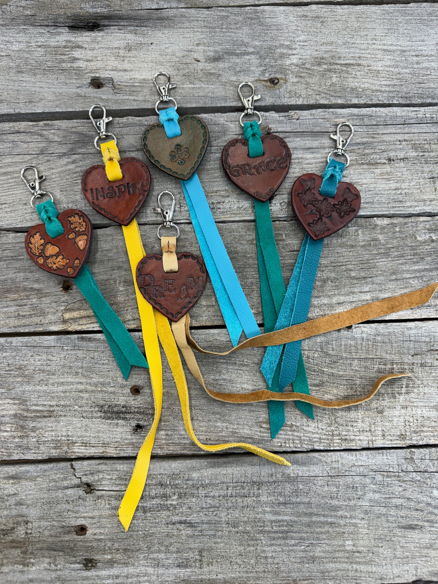 Add a touch of heartfelt Western charm to your purse, bag, or keyring with these hand-stamped leather heart charms. Each one is hand-cut from 8/9 oz full-grain leather, hand-painted or stamped, and finished with a colored pigskin suede strap tied in a traditional Western blood knot.