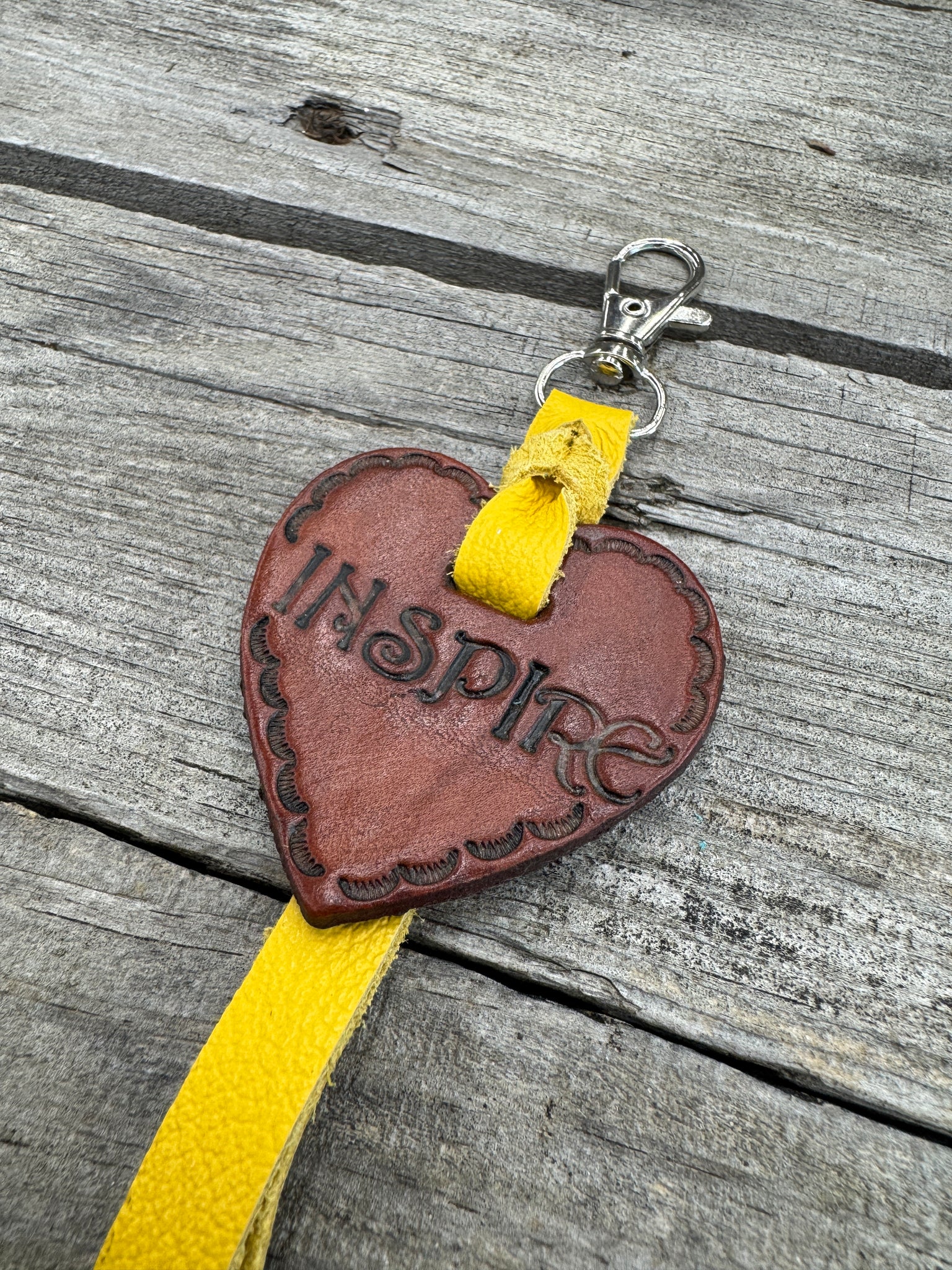 Inspire – Hand-stamped lettering “Inspire” with bold yellow strap; overall length 13”