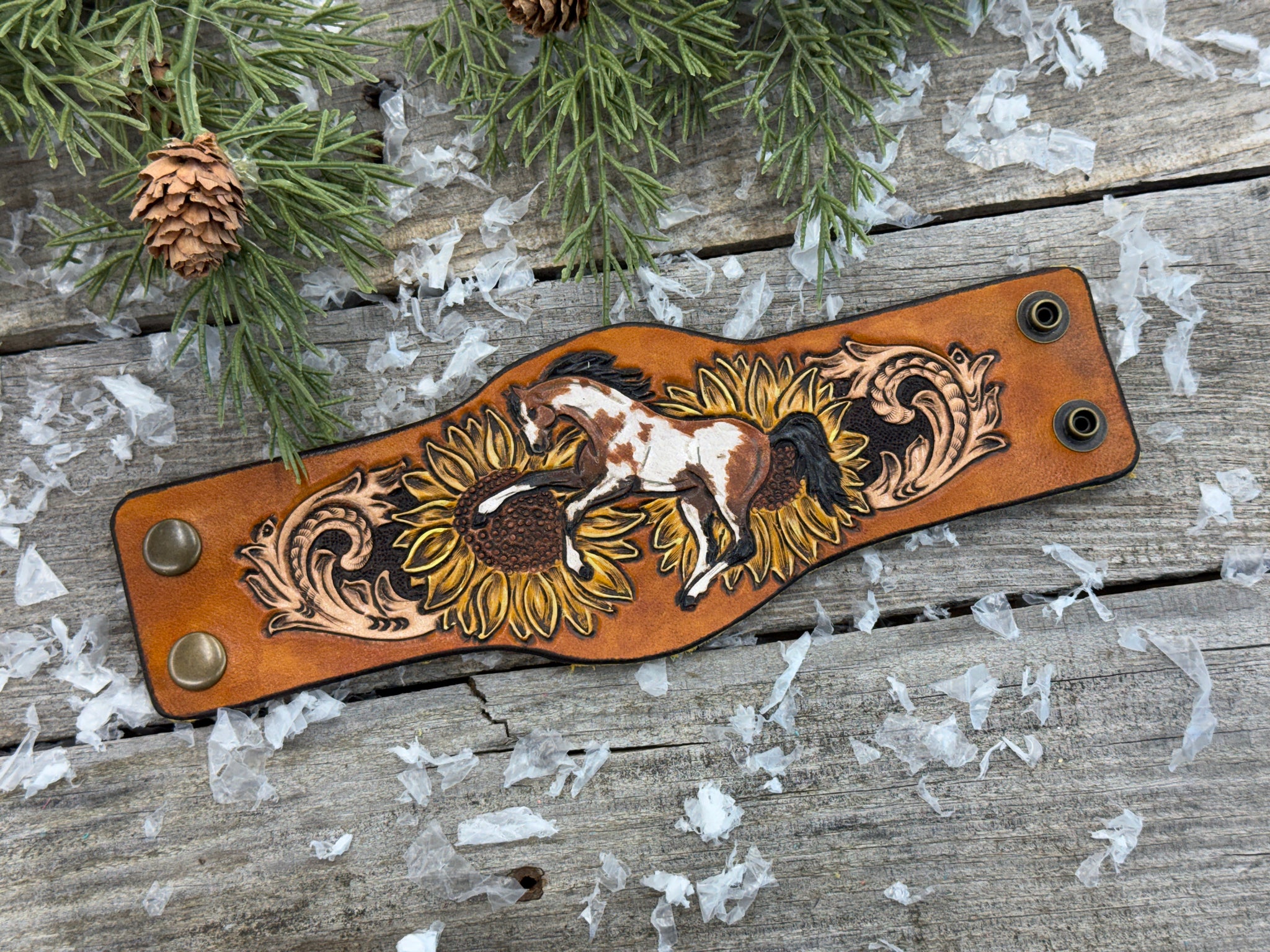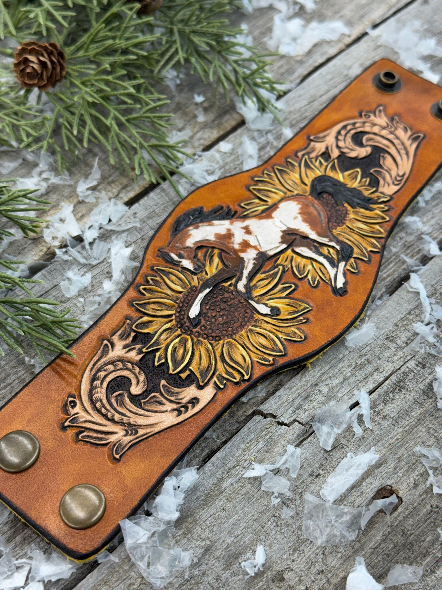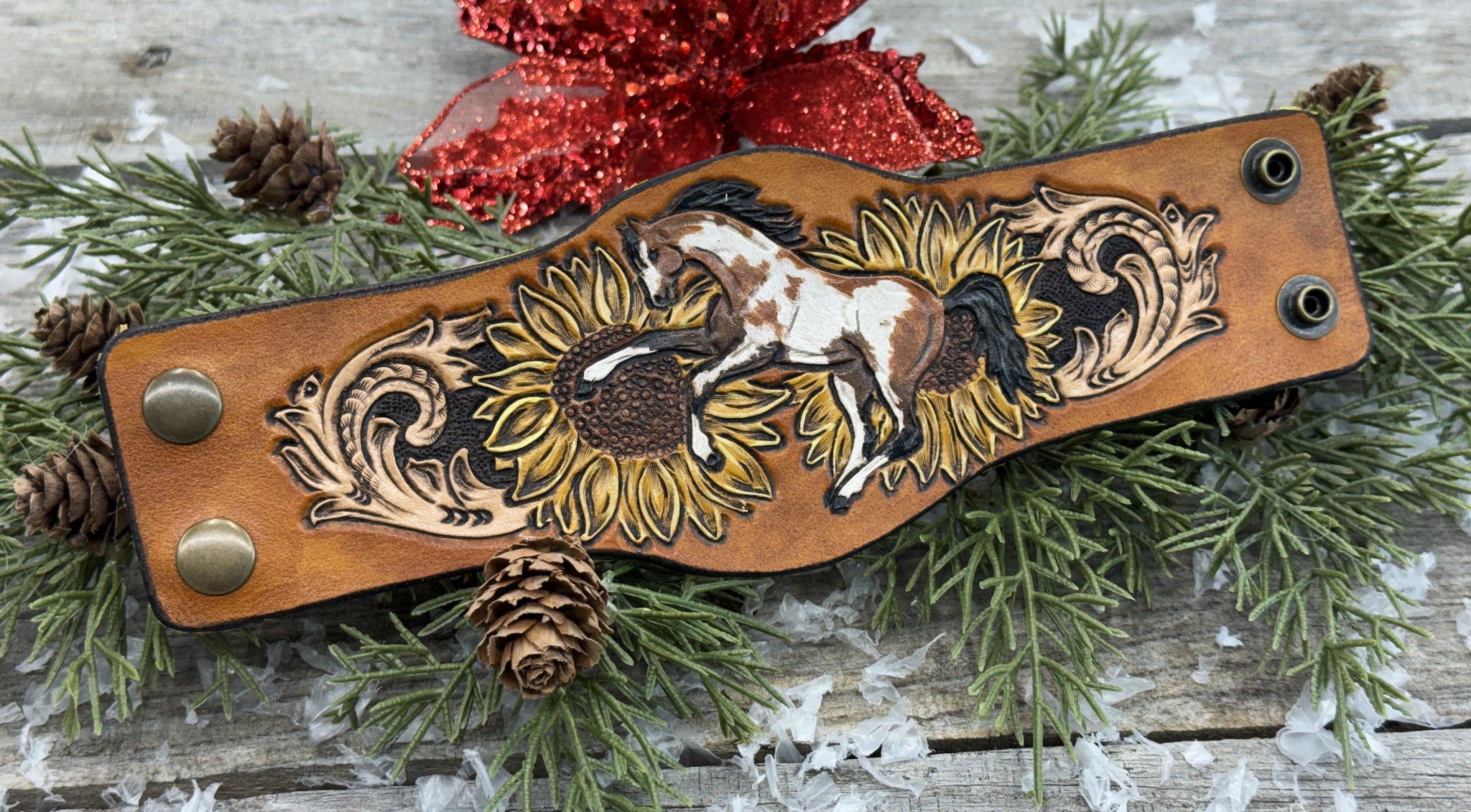 Make a bold Western statement with this one-of-a-kind hand-carved and hand-painted leather cuff bracelet, featuring an original wild paint pony design surrounded by two vibrant sunflowers and flowing Western scrollwork. Each element of this piece is drawn, carved, and painted by hand — making it truly wearable art straight from the Cherokee Rose Custom Leather studio.