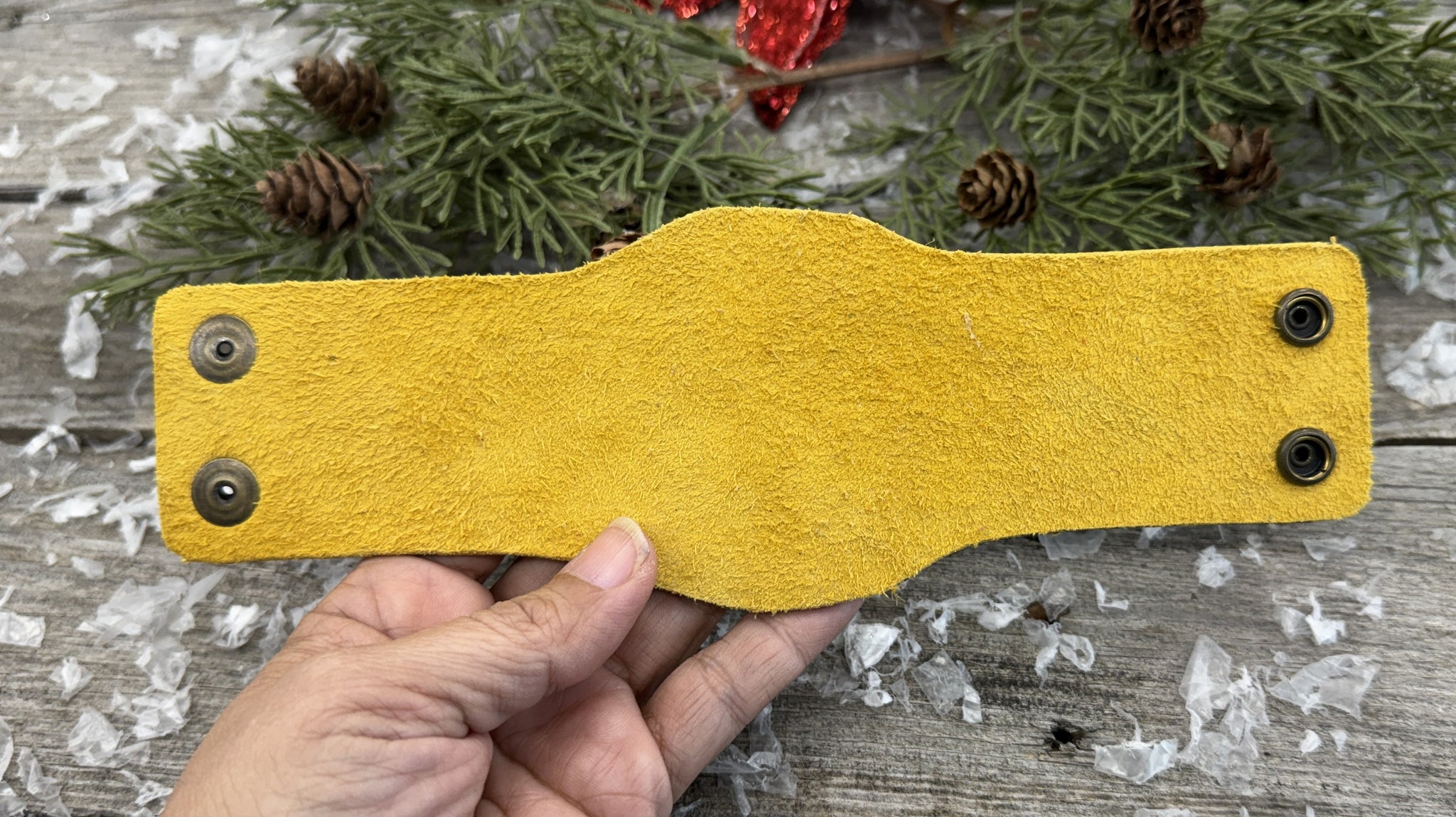 Crafted from 4/5 oz full-grain leather, this cuff is 8 ¾” long with antique brass snaps set at 8” for a secure fit. It measures 3” at its widest point, giving it a striking presence on the wrist. Lined with bold yellow pigskin suede leather, it’s comfortable to wear and beautifully finished inside and out.