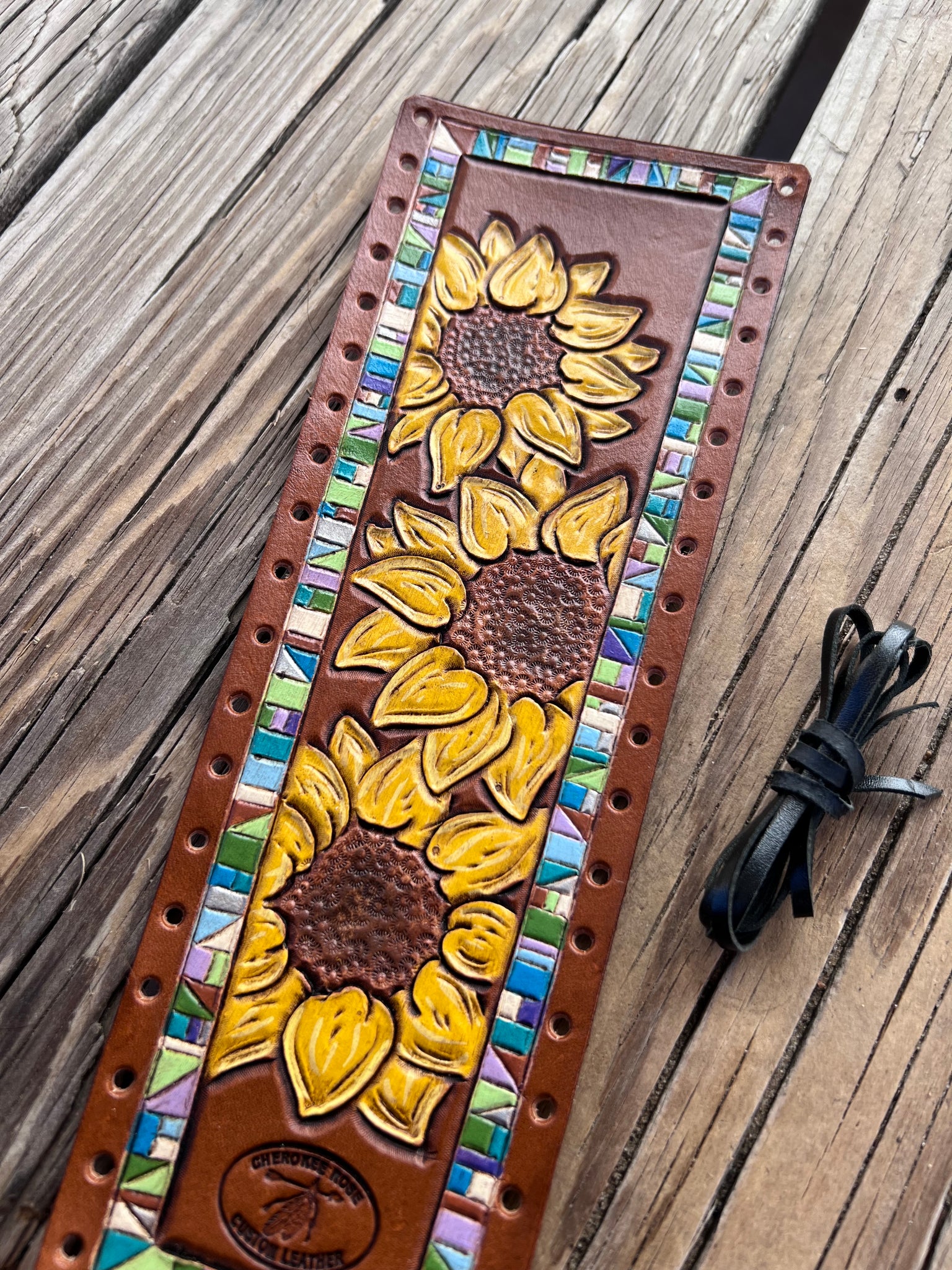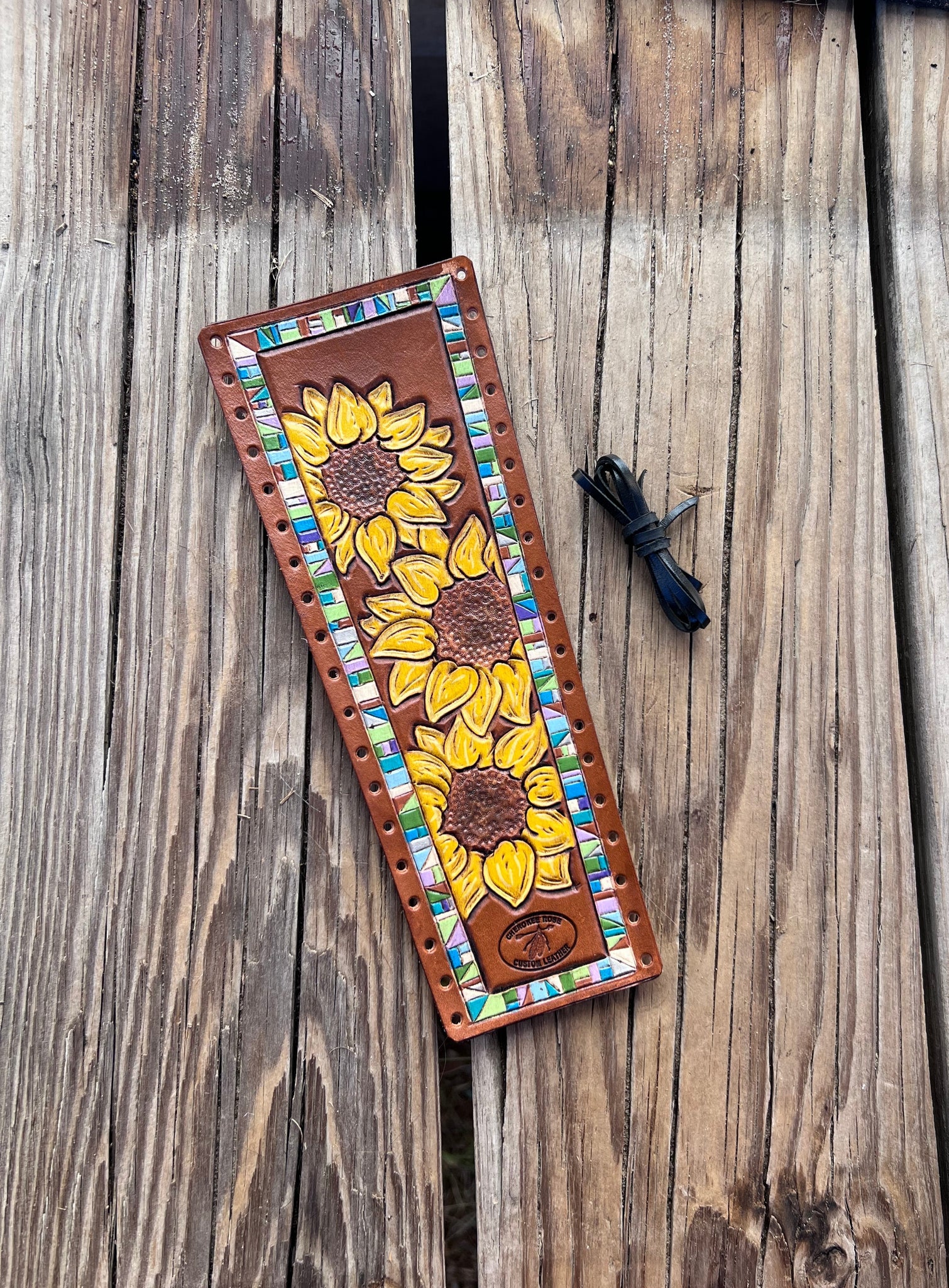 Introducing the perfect addition to your show outfit: this one-of-a-kind show stick wrap! Handpainted with a sunflower trio and a turquoise border, this wrap is made from real cowhide leather and provides style and class that'll take your performance to the next level. Put your competitors in the shade and show your stuff!