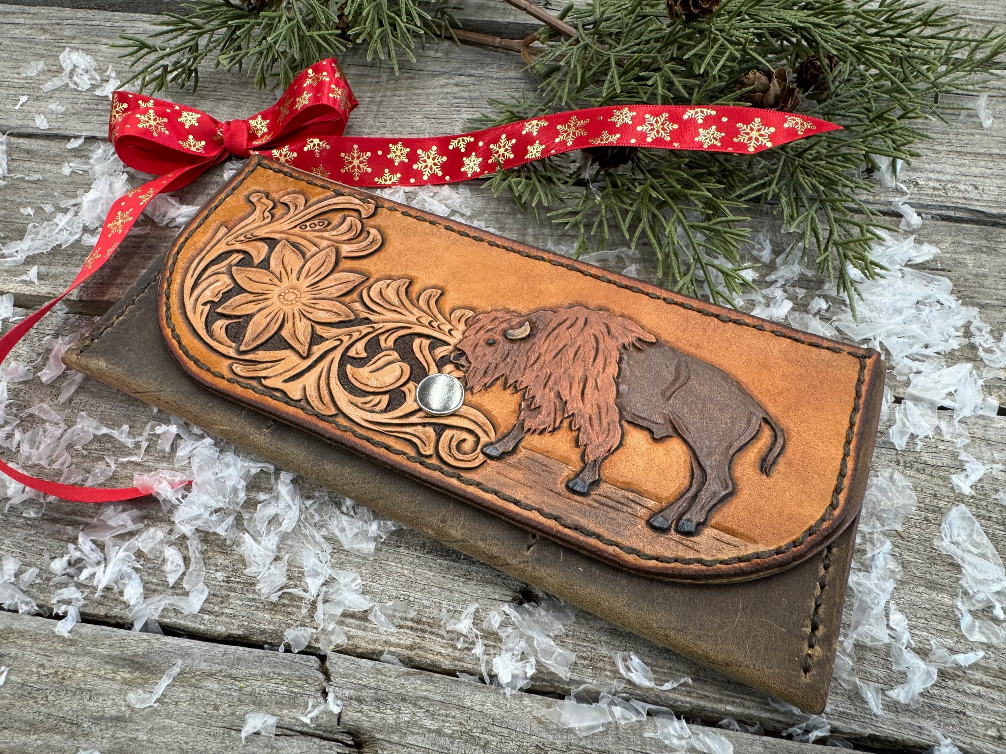 Carry your essentials in style with our Western Floral Bison 3 Card Ladies Clutch Wallet. Made in the traditional western floral style, painstakingly hand carved and hand painted design, this wallet is a one-of-a-kind piece.